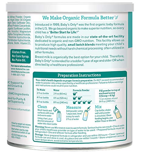 Details: Baby's Only Organic dairy with whey protein toddler formula is a Non-GMO baby formula meant for children age one and above. The whey protein included in this formula may help children with digestion and stooling issues that can occur when transitioning from breast milk to formula. This dairy formula includes alpha-linolenic and linoleic fatty acids-the same ones found in breast milk-to aid in brain and eye development. We've made our formula organic, gluten-free to ensure your child gets the purest nutrition possible. Our formula is made in the u.s.a. Each 12.7 ounce can makes 84 total fl oz of Baby's Only Organic dairy with whey protein toddler formula. See nutrition facts panel for allergens.