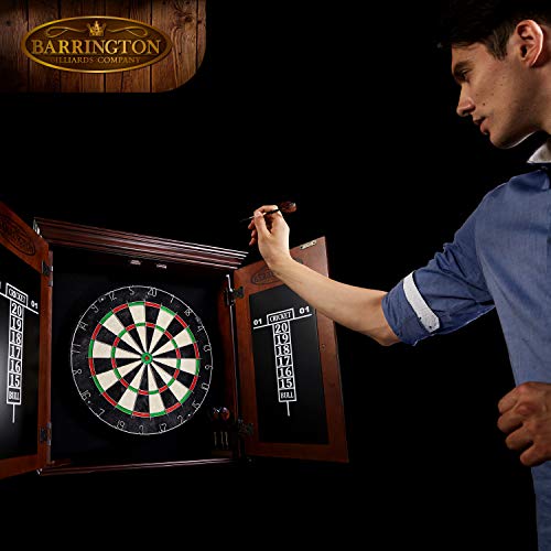 Details: Accessories included: Includes all the essential accessories and mounting hardware required for a regulation dartboard match, including a wall mounting bracket, 6 steel tip darts and flights, score board and 1 marker. Premium cabinet: This custom dartboard cabinet case can hang on any wall in a home, rec room or pub area. The strong box joint construction helps the doors to open smoothly and easily. The premium hinges prevent cabinet doors from slamming, which protects your dartboard and cabinet from wear and tear. Traditional dartboard cabinet design: The traditional dartboard cabinet design is the perfect accessory for any game room, home bar, break room or man gave. The dartboard cabinet also matches perfectly with Barrington billiards products.