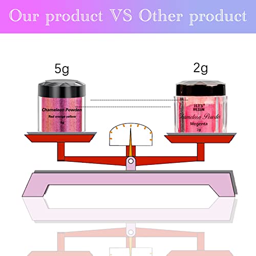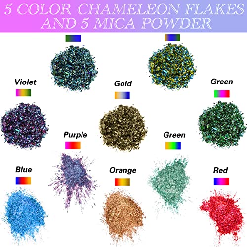 Details: WHY CHOOSE US? 5 Colors Chameleon Powder & 5 Colors Chameleon Flakes: Included 10 different color changing mica powders, highly saturated mica pigment powder luster that shift intense colors depending on the angle it is viewed. 2 Brushes Included for your convenience Chameleon Mica Powder: Each 5g/0.17oz, the whole weight is 40g/1.36oz. (Note: The color changing pigment have a different volume because of powder's density.) Color Shift Mica Powder: chamelenon mica powder, so beautiful,With confidence for all your DIY and craft projects and enjoy the colorful results by using our Mica Powder for Epoxy and Resin Dye. " SOAP COLORING PIGMENTS: shimmering mica powder is a great soap colorant giving best results in the melt and pour soap and in transparent soap base,soap dye,epoxy resin color resin art MICA POWDER LIP GLOSS PIGMENT: Mica Powder Pigment is a natural product of cosmetic grade. Widely used as a cosmetic pigment for a variety of makeup, lipstick, eye shadows; purple, red and pink mica powder colors are a very popular ingredient in lip gloss making supplies,epoxy resin dye Chameleon Mica Powder For Resin: Dusted into silicone molds backed with black resin to achieve the most professional and beautiful results possible with your resin crafts!pearl pigment powder Color Shifting Mica Powder: Epoxy resin pigment,A little powder goes a long way and giving your crafts an amazing collection of bright, shimmering effects. Gorgeous bright color shifting, highly saturated mica pigment powder luster that shifts intense colors depending on the angle it is viewed.bomb colorant, bath bomb colorant,100% safe and easy to clean. Package: 5 Colors Chameleon Powder 5 Colors Chameleon Flakes 2 Brushes Included "Widely Application: resin soap epoxy resin soap making lip candle making slime soap making lip making lip gloss powder epoxy