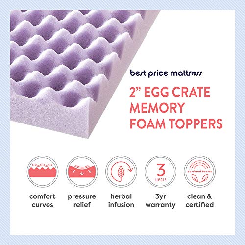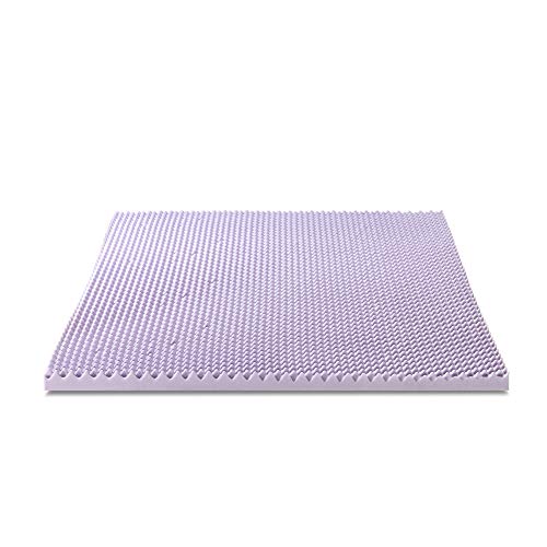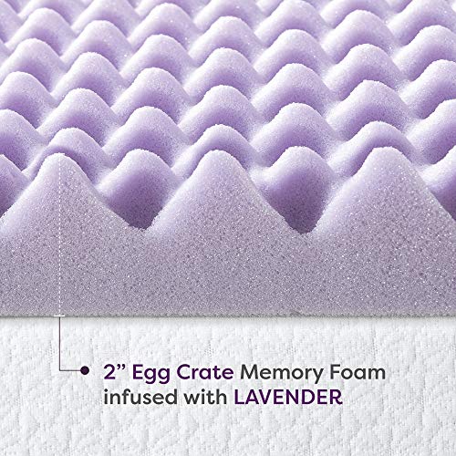 Details: We introduce the newest in design, an innovative premium memory foam mattress topper that will ease you into a soothing night with a lavender infusion. It's the memory foam you love infused with soothing lavender to provide both comfort and ultimate support. Memory foam is well known for its body contouring features and pressure relief comfort throughout your whole body. Once you lay down, our memory foam toppers will start reacting to the temperature of your body and begin to mold itself to your shape, evenly distributing your weight. The egg crate memory foam structure is made for better airflow while providing a customized level of support. Combined with our pressure relief system, you will enjoy total relaxation with ultimate support in key areas including the head, shoulders and hips.