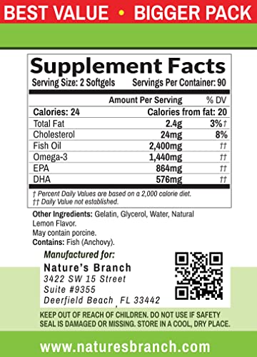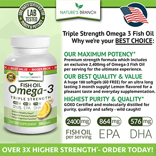 - ★ NEW 3 MONTH SUPPLY [180 SOFTGELS] - PREMIUM OMEGA 3 FISH OIL PILLS ★ Our highest concentrate, 2400mg triple strength, molecularly distilled premium Omega 3 softgels delivering 1440mg ESSENTIAL FATTY ACIDS in every serving with 180 lemon flavor, burpless capsules in every bottle! Our unique pills contain OVER 3X MORE FISH OIL than many other leading brands!