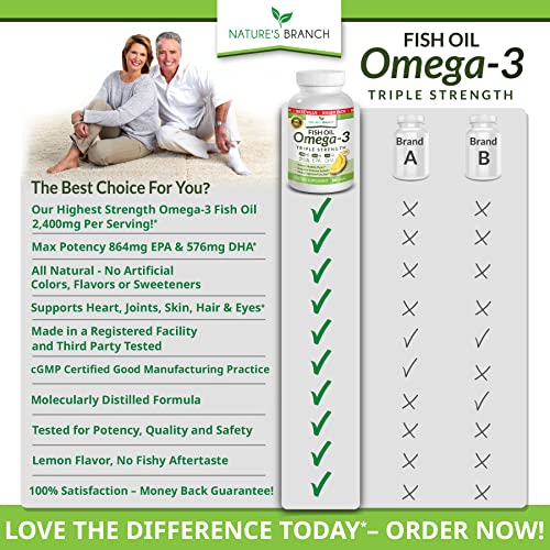 If so, Nature's Branch Omega 3 Fish Oil is your best choice delivering 2,500mg of fish oil in every serving! While cheaper Omega 3 supplements provide small amounts of health promoting fatty acids, our Omega 3 Fish Oil delivers 1,640mg essential fatty acids per serving with 860mg EPA and 650mg DHA, perfect for cardiovascular health, joint support, eyes, brain and nerve function + many more bodily systems!
