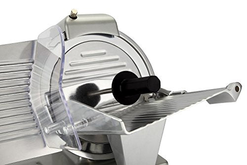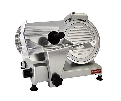 Details: Thanks to Chromium-plated coating Carbon steel & high temperature treatment process, Beswood slicer's blade stays sharp longer and is protected from corrosion. Because there is no need to sharpen frequently, the blade is more durable and is guaranteed to have a longer lifetime. Beswood food slicer aslo includes: *Premium V-belt with noticeable noise and vibration reduction. *Double illuminated ON/OFF switch 24V to avoid power shock for best protection. *Skidproof Rubber Feet & Blade Ring Guard for safety. *Aluminum body with top-mounted, two stones blade sharpener maintaining a consistently sharp blade edge. *USA standard approved: ETL, NSF. Beswood slicer is perfect for commercial use in restaurants, commercial kitchens, cafes and in-home use as well. It is able to slice boneless meat, cheese, ham, bread, veggies with high standard performance. Specifications: *Blade Diameter: 10”*Power: 110-120V, 240W 1/3HP *Blade revolution: 282/min *Maximum cutting length: 210mm (8-1/4”), Maximum cutting height: 170mm(6-7/10”)*Slicing thickness: 1-12mm (about 0- 1/2”) Package: 1X food slicer machine, 1 X Instruction Manual,1xcleaning brush,1x food machine oil Note: Pls note that the Chromium-plated coating Carbon Steel Blade is made and imported from Italy, the Beswood food slicer is assembled in China.