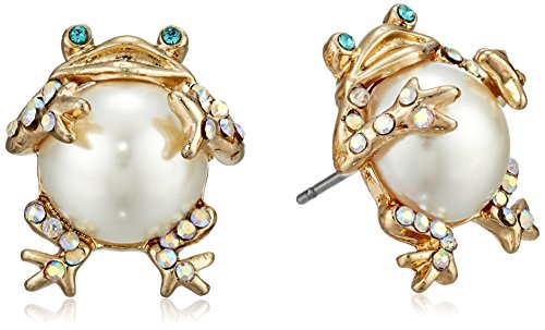 - Charming frog stud earrings detailed with pearl and delicate stone accents. Earrings are set in gold-tone metal with a post back closure.