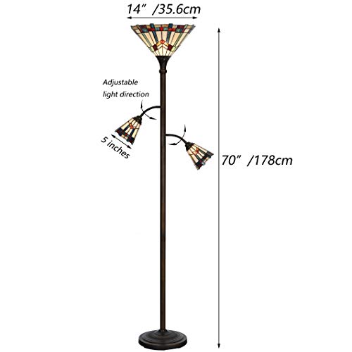 Details: Mission style lamps are inspired by the Arts and Crafts Movement of the turn of the Twentieth Century. “Mission-style lamps” now usually refer to a particular shape of the lampshade, which was the type most commonly produced during the Arts and Crafts Movement. The lampshade has a number of flat sides, usually four. These are usually isosceles trapezoids, with the narrow side near the top and the wider end near the bottom. These four (or more) trapezoids are connected together at their edges, and an opaque square connects their narrow ends at the top. (Note that Mission-style outdoor lighting refers to a much wider range of styles). This is a Tiffany-style mission floor lamp, it is handmade by skilled craftsmen, The small lights on the side of the base can be lighted separately, they can be used as reading or working lights. There is a 4-way rotary switch on the top, you can choose Main Lamp On, Side Lamp On, or Both On according to your needs. Additionally, we add an in-line footswitch that can turn the entire lamp on and off. the lamp base is heavy and durable, the color of the stained glass looks stunning when you light it up. This lamp is not only an amazing night light but also great artwork in the daytime. you definitely will receive many compliments.
