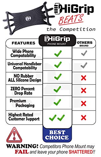 - WIDE PHONE COMPATIBILITY -HiGrip's premium bike accessories such as this high stretch universal bike phone holder has strong silicone bands that are capable of holding 4 to 7 inch smart devices, you wont miss a call when your cellular device is securely mounted and within arms reach