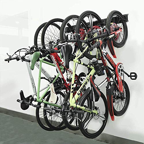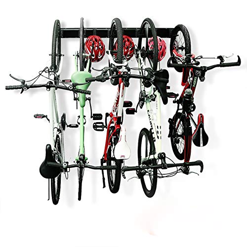 - ADJUSTABLE WALL STORAGE SOLUTION FOR BIKES → It can organize up to 5 bikes and 3 helmets. Free up space in your home or garage. Easy to hang on and take off the bicycles. Our heavy duty bike stand fits for most of the bicycles, like mountain bikes, road bikes, kids bikes etc. Please pay attention to rims of your bikes, make sure it is lesss than 4.4inch, fat tire won't fit this bike storage rack!