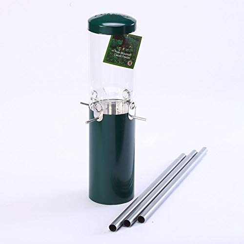 - Includes [1] "Classic Feeder with Squirrel Baffle and Pole| Material: UV resistant polycarbonate seed reservoir, aluminum ports and perches with baked enamel coatings| Color: Green Top and Bottom| Measurements: 6 in. (W) x 12 in. (H) tube, 23 in. (H) with baffle; Capacity 1.2 gal