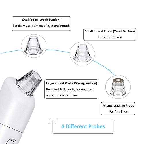 - [4 Pore Extractor Probes]: The blackhead remover kit includes 4 piece of replaceable probes, Oval Probe is designed to smooth fine lines, small round probe cleanses pores with weaker suction, big round probe is for comedo suction and skin tightening with strong suction, the last one is microcrystalline probe which help massage and exfoliate skin.