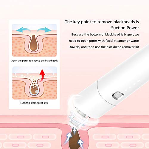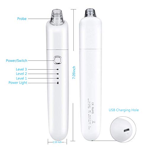 - [Professional 3 Suction Levels]: the whitehead remover tool is suitable for different types of face skin, such as dry skin, oily skin and neutral skin. There are 3 levels of suction power up to 65 KPA, Level 1 for first use and sensitivity skin, Level 2 for cheek, chin and T-zone and nose, Level 3 for stubborn blackheads removing.