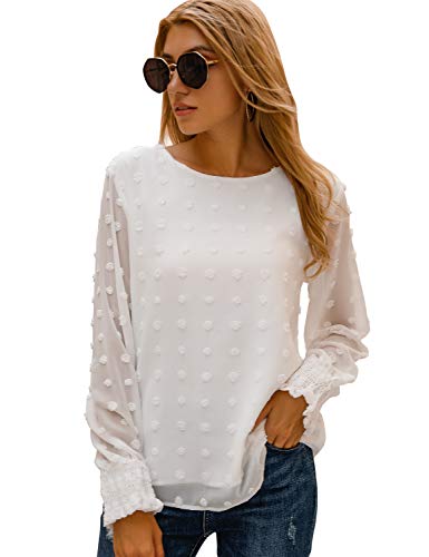 - Features: this cute tops for women shapes with classical round neckline, the lantern sleeves with smocked cuffs give this top a beautiful bloused look.sheer mesh sleeve detailed with knitted accent pom poms,and a relaxed bodice that falls into a straight hemline,flowy shirt.