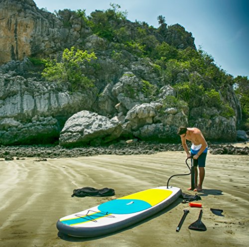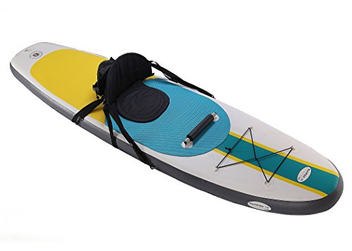 - A COMPLETE KIT: This set includes everything you need - 10-foot by 32-inch wide board, 6 inches thick, a convertible floating paddle that can easily change from SUP to kayak, a lightweight detachable seat and footrest, a travel backpack, a coil leash, a 2-way high pressure pump, and a detachable third fin