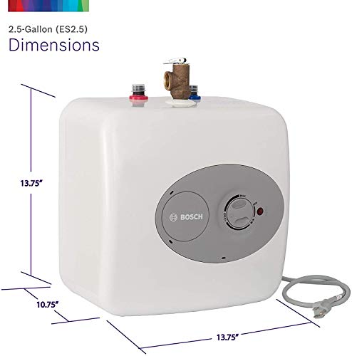 Details: Product Description Get hot water where it's needed, when it's needed with the Bosch ES4 Tronic 3000 T Electric water heater. This 2.5-gallon capacity point-of-use mini-tank fits right under your sink and provides a practical and effective solution to your hot water needs. This smaller model can be plugged right into a 120-volt outlet with the 36-37" cord, or can be installed in-line with a larger hot water source to provide "on-demand" use. The glass-lined tank offers great insulation and added durability, while the heater's fast recovery rate eliminates long waits for hot water. An external dial allows you to easily control the temperature range, and the temperature-and-pressure relief valve enhances your safety. The ES4 Tronic 3000 T from Bosch has a sleek and attractive exterior design that blends in seamlessly with existing décor when installed in a visible location, making this heater a great option in any room. Manufacturer Contact Information 800-283-3787