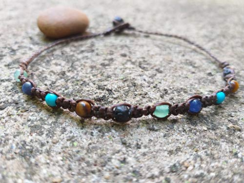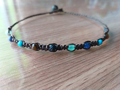 Details: Bracelet for Men and Women. Handmade work Contains 4 mm Kyanite stone,Jade green stone, tiger eye stone ,Turquoise blue stone,lava stone, Knitted with rope, Close with 8 mm lava . length 7.5 inches