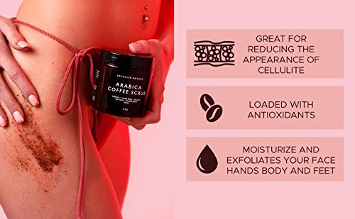 Details: COMBAT CELLULITE NATURALLY: Our Coffee Body Scrub, Facial Scrub, Hand Scrub, and Foot Scrub is great for reducing the appearance of cellulite! Massage our anti cellulite coffee body scrub onto any problem area. It may help reduce the appearance of cellulite. We combine the best quality coffee grounds with moisturizing, skin-soothing coconut oil and dead sea salt for an extra exfoliating and moisturizing kick. Use for a better experience than any cellulite cream or cellulite removal cream. SPA QUALITY BODY SCRUB, FACIAL SCRUB, FOOT SCRUB, & SKINCARE TREATMENT: Exfoliating your skin to remove dead skin gives you a fresher, younger, and moisturized appearance. The coffee grounds in this body scrub are a natural exfoliator that help freshen your skin, and reveal new, healthy skin underneath. Arabica Coffee contains enzymes and acidic properties that help exfoliate and remove dead skin.. REDUCES SIGNS OF AGING SKIN: This Body Scrub & Face Scrub Exfoliator and Moisturizer can help with aging skin! Our exfoliating and moisturizing Body Scrub is loaded with antioxidants, which help fight the appearance of premature skin aging like wrinkles, sun spots, and fine lines. The caffeine restricts blood vessels, which reduces swelling and inflammation. When applied under and around your eyes, it can help in minimizing the appearance of puffy eyes and dark circles under your eyes. VERSATILE SKIN CARE FULL BODY SCRUB: This extremely versatile exfoliating and moisturizing scrub can be used as a face scrub, lip scrub, body scrub, hand scrub, foot scrub, and more! Use everywhere on your body to keep your skin smooth and clear! It works as an amazing exfoliator, while not drying out your skin like a lot of other exfoliating products do. It also keeps your skin moisturized and smooth, and it smells amazing! 100% NATURAL ARABICA COFFEE BODY SCRUB, FACIAL SCRUB, HAND SCRUB, & FOOT SCRUB: Our Arabica Coffee Body Scrub is made in NY, USA