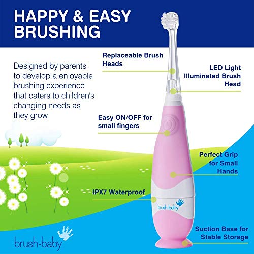 - GROWS WITH YOUR CHILD: Start as infants and continue as they grow to toddlers with the included replaceable brush heads for babies (0-18 months) and toddlers (18-36 months), battery powered (included AAA battery).
