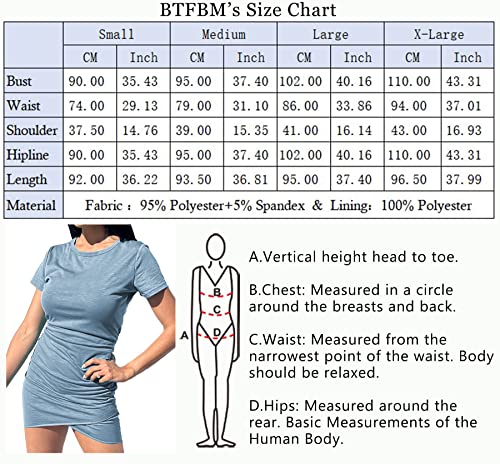 Details: BTFBM - Vestido de manga corta con cuello redondo clásico de manga corta, sexy, estilo casual, elástico, para verano Vestido corto de moda de BTFBM Tejido elástico de alta calidad de mezcla de algodón. Ajuste de figura con forro completo que evita problemas de visión. Diseño femenino sexy con pequeños detalles: un lado con dobladillo de piel sintética. Adecuado para zapatillas, tacones o sandalias. Detalles clásicos como el cuello redondo femenino, mangas cortas y un corte ajustado de Bodycon favorecen tu silueta. Conjunto de dobladillo irregular con fruncido lateral y envoltura frontal que completa el aspecto del mini vestido de mujer. Consejo: simplemente resbala, disfruta de la sensación de relajación de algodón súper suave con estiramiento en la piel y resbala en un par de zapatillas, sandalias o tacones sobre la marcha, ¡listo! El vestido versátil te acompaña en cualquier lugar en días cálidos y garantiza siempre su forma fina en tu maleta de vacaciones. Debe tener! Tabla de tallas sobre el vestido de verano para mujer de BTFBM, casual, diario, ligero, de algodón, con mangas cortas US S: Busto: 92 cm/36.22" --- Cintura: 76 cm/29.92" --- Cadera: 90 cm/35.43" --- Longitud de la manga: 16.5 cm/6.49" --- Longitud del vestido: 92 cm/36.22" US M: Busto: 38.2 in --- Cintura: 31.9 in --- Cadera: 37.4 in --- Longitud de la manga: 6.8 in / 6,79 pulgadas --- Longitud del vestido: 36.8 in / 36,81 pulgadas. US L: Busto: 40.94" --- Cintura: 34.64" --- Cadera: 40.15" --- Longitud de la manga: 7.08" --- Longitud del vestido: 37.40" US XL: Busto: 112 cm/44.09" --- Cintura: 96 cm/37.79" --- Cadera: 110 cm/43.30" --- Longitud de la manga: 18.75 cm/7.38" --- Longitud del vestido: 96,5 cm/37.99" Puede haber una diferencia de 2 a 3% en las medidas debido a la medición manual.
