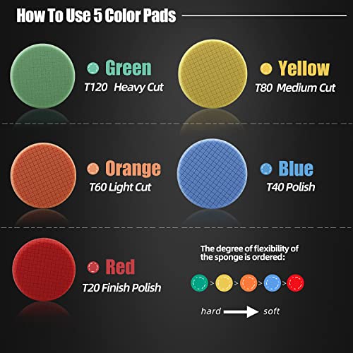 - Compounding & Polishing & Waxing◆ There are five different colors of the sponge pad : Green/Yellow For Heavy Cut ,Orange For Medium Cut ,Blue For Light Cut ,Red For Finish Polish and Waxing, Great for removing sun abuse, car scratches, headlight wearing and etc. Green/Yellow Heavy Cut pad suitable for removing oxidation coating and moderate to light scratches. Orange polishing pad for removing sun abuse and swirl mask. Blue pad for polish, The red for finish polishing and waxing.