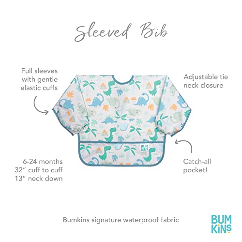 Details: The Bumkins Sleeved Bib saves one outfit at a time. With a handy crumb catcher / catch-all pocket for containing spills. Generously sized and made from Bumkins’ original lightweight waterproof fabric. Wipeable and machine washable for easy cleaning so you can use it over and over again. Plus, it’s safe to use. Our bibs are BPA-free, PVC-free, vinyl-free, phthalate-free and lead-free. Sized to fit ages 6 to 24 months. Adjust fit with back tie closure and adjust sleeve length with the elasticized cuff. Measures approximately 14” across the chest, 13” from neck down and 32” from cuff to cuff. Designed in Arizona, responsibly made in China.