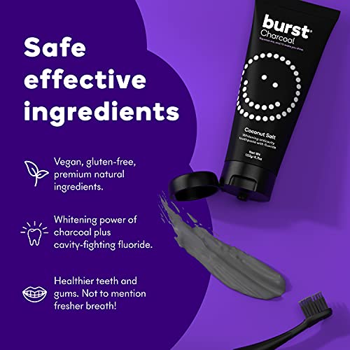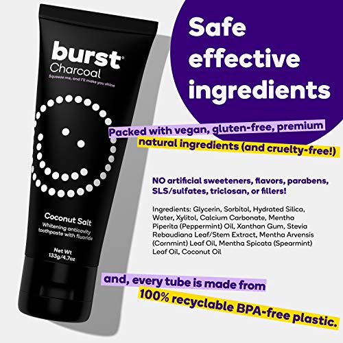 Details: BURST Charcoal Toothpaste includes the maximum whitening power of charcoal (without being abrasive) plus cavity-fighting fluoride. The coconut salt flavor is mildly sweet and not too coconutty. 4.7 oz (133g) per tube. Made in the USA.