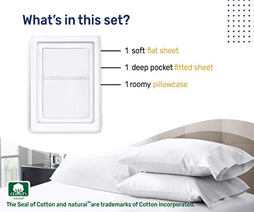 Details: The choice is Yours: 100% Naturally-Sourced Cotton Sheets or Artificial Microfiber Sheets Luxury Hotels use 100% cotton sheets while cheap motels use Microfiber. At California Design Den, we prefer pure cotton above other fabrics, because cotton sheets are naturally easy on your skin, and regulate body temperature while microfiber gets hot and sweat building bad odor. Microfiber is made from non-biodegradable plastic which causes pollution, whereas cotton is from plants - safe, pure and natural. It’s the right choice for you and the planet. Made with Pure Soft Cotton and Lustrous Sateen Weave for Smooth Comfort Our sheets are made of 100% long-staple cotton with 400 thread count per inch, and a lustrous sateen weave for durability, and breathability. Rest easy with our soft sheets and pillowcases that are made using pure cotton yarns for ultimate comfort. Our smooth cotton sheets complement all kinds of decor to bring a lasting style and comfort to your bedroom. Premium Quality Sheet Set with Perfect Fit The 4-piece bed sheet set comprises a top flat sheet, a no pop-off fully elasticized fitted sheet, and two standard pillowcases. Our sheets are made using the highest quality dye which is machine washable and give the feel of new sheets after every wash. The fabric is checked for no pilling, shrinkage, tear strength, and thread count authenticity for durability and easy care. Exceptional Craftsmanship to Create Safe and Luxurious Bedding Expertly and ethically made, our flat sheets are stitched to perfection to provide the look and feel of Egyptian cotton linens for luxury, style, and comfort.