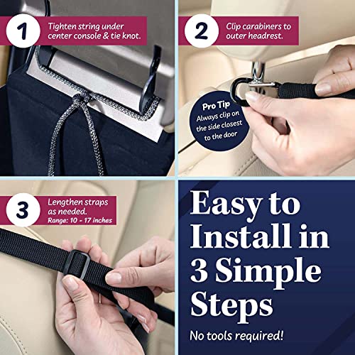 - REQUIREMENTS - Our car purse holder between seats works with center consoles that open from the front (cannot slide open) and have accessible headrests. Middle or side-opening consoles will require additional hooks.