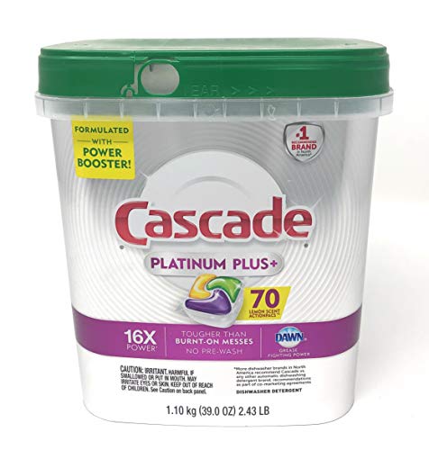 Details: Formulated with POWER BOOSTERNo pre-wash needed! Cascade Platinum PLUS+ dishwasher detergent removes burnt-on foodCascade Platinum PLUS+ ActionPacs dissolve, lift, and rinse away foodWorks in both hard water and soft water to keep your dishes sparklingBuilt in grease-fighting power of Dawn; Phosphate free.Cascade Platinum Plus Dishwasher Pods, ActionPacs Detergent, Lemon, 70 Count