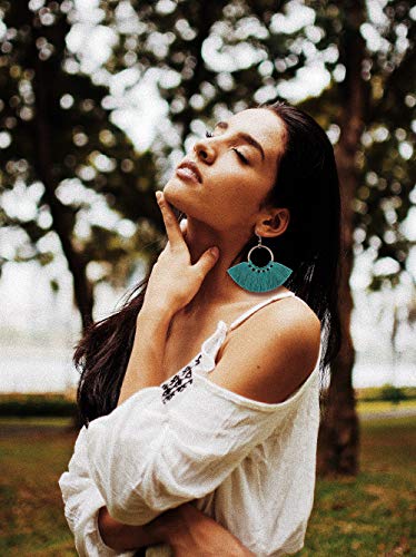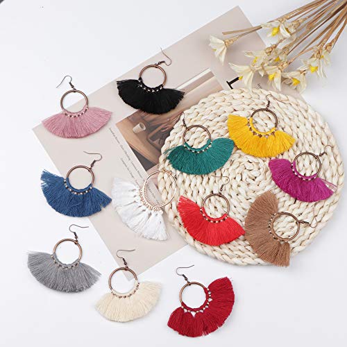 - Special Design: a combination of alloy and natural cotton fringe. Give you a shining and natural wearing experience. There are 12 colors each set. Rainbow fan shaped bohemian earrings make you more attractive and eye-catching among the crowds of people.