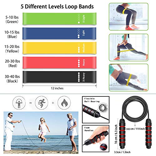 - DURABLE LOOP RESISTANCE BANDS: The bands are made of 100% natural latex & free of TPE and come in 5 resistance levels: Green X-Light, Blue Light, Yellow Medium, Red Heavy, Black X-Heavy. Ideal for improving strength and mobility – 【used for integrated seamlessly with every popular workout program including Yoga, Pilates】 – 【Perfect for squats, strengthening leg muscles, knee thrusts, lateral shuffles.】