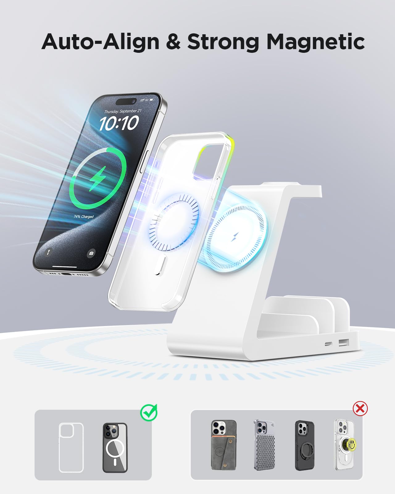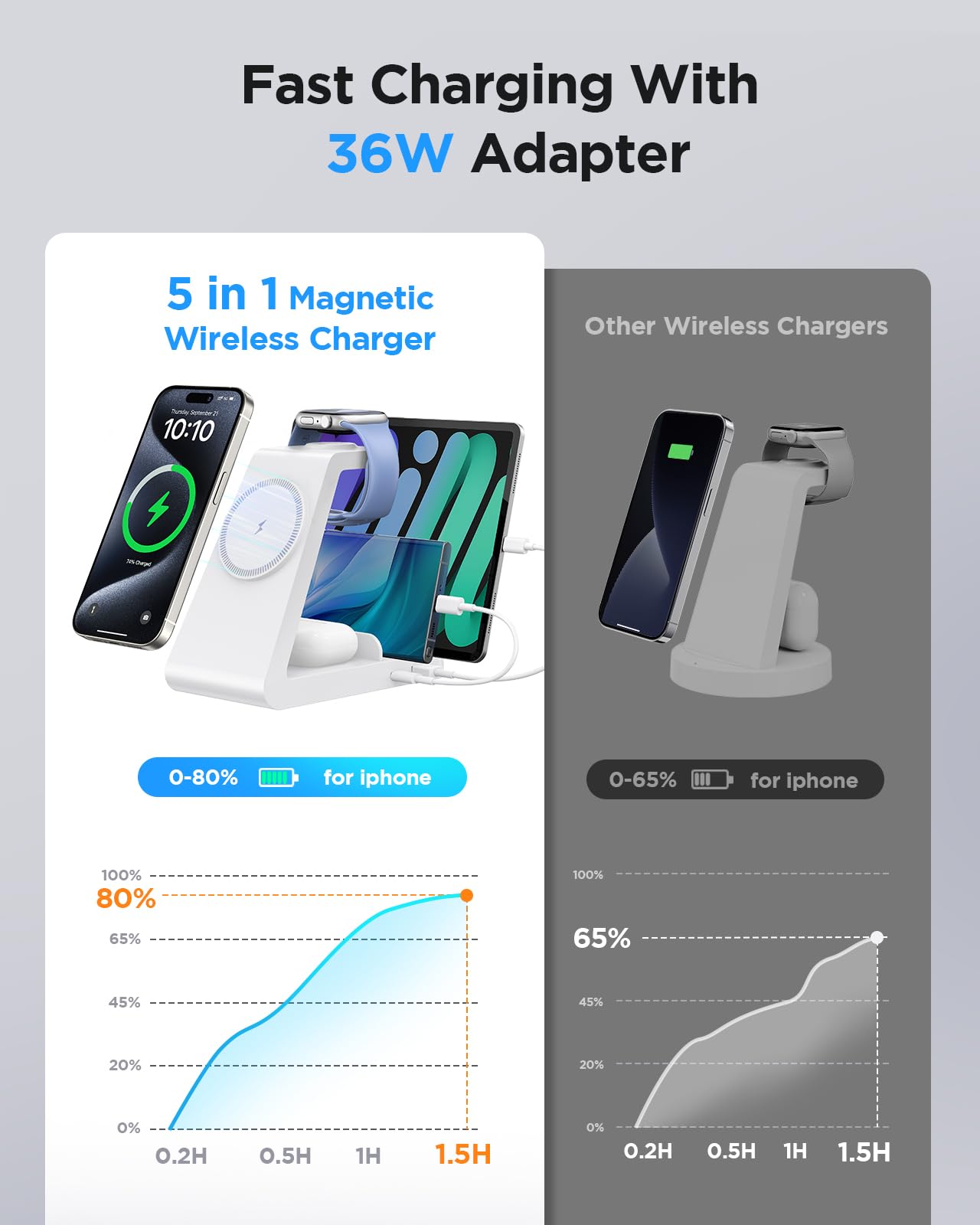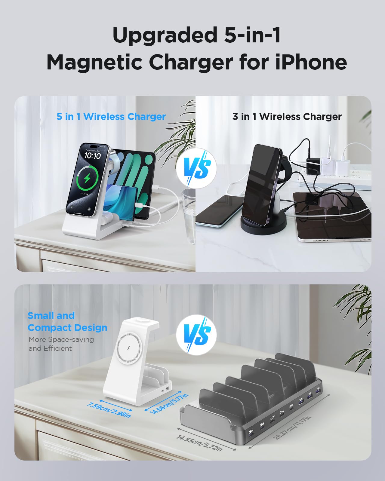 - 【2024 Upgraded 5-in-1 Magnetic Wireless Charger】The 5 in 1 wireless charger is an innovative charging device we are dedicated to creating,which can simultaneously charge for iPhone, iWatch, iPad, and Android phone.A charging station can meet the charging needs of multiple electronic devices,you from messy charging cables and desktop space occupied by multiple chargers, bringing convenient experiences to life and work,and enjoying the life brought by technology!