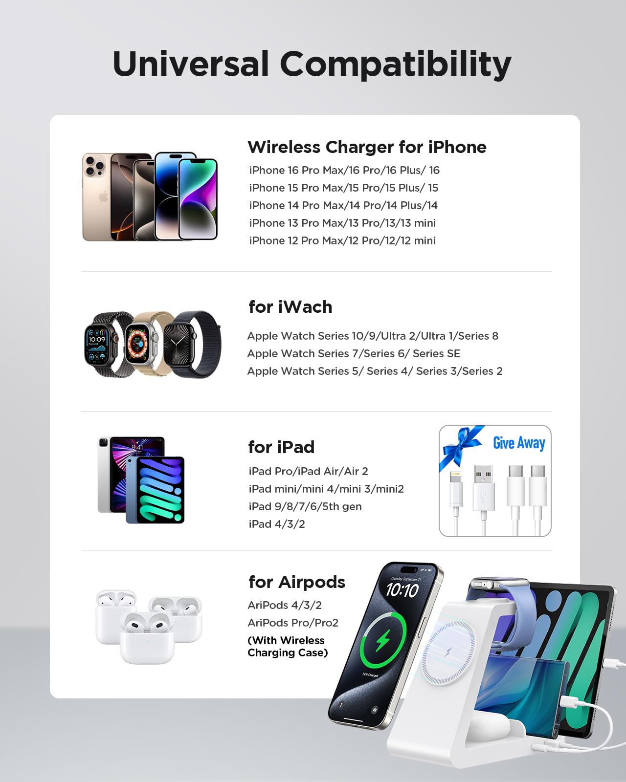 - 【Wide Compatibility】Our charging station for apple devices is designed to optimize desktop space.Mag-safe wireless charge for iPhone 15/14/13/12 Series.Wireless Charge for iWatch Series 9/Ultra 2/Ultra 1/8/7/6/SE/5/4/3/2.Wireless Charge for AriPods 3/2/Pro/Pro2(with wireless charging case).USB to lighting cable charge for iPad Pro/iPad Air/Air 2/iPad mini/mini 2/mini 4/iPad 4th/iPad 4/3/2.