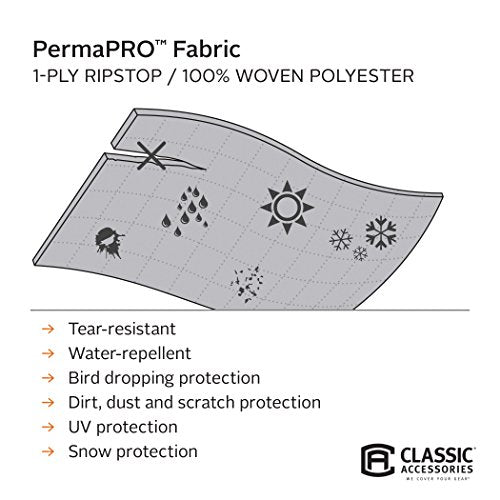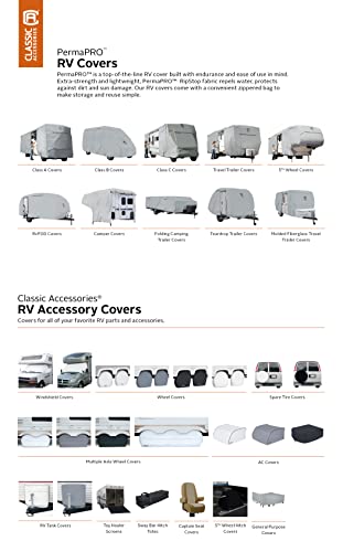 Details: Product Description PermaPRO RV covers provide maximum protection to keep your RV in top shape all year long. Air vents, tension panels, and extra-long zipper pulls make this cover stand out from all the rest. When you are ready to hit the road, this manageable cover fits effortlessly into its storage bag. When you buy from Classic Accessories, you’ll receive peace of mind along with your product. we invite you to file a simple claim on our website, backed by our Customer Support Team. Amazon.com Protection In Any Climate or Season Weather and Damage Protection PermaPRO covers by Classic Accessories provide maximum protection from rain, snow, dirt and UV damage. Ripstop fabric is stronger and 57% lighter than most RV covers available. Rolling up and storing your RV cover has never been easier. Each cover comes in an expandable storage bag that unzips to reveal five additional inches of height in storage space. The bag can fit into storage spaces as small as 13” x 23” x 18”. Backed by a four year warranty. Prevent Rips and Tears NEW lightweight PermaPRO ripstop fabric provides maximum strength protection COMPACT! Expandable zippered storage bag fits into small storage compartments Fits to Your Vehicle Adjustable front and rear tension panels with elasticized hem corners give a custom fit Accessibility Zippered panels with extra long zipper pulls reduce the need for a ladder Ventilation Air vent system reduces wind stress and interior moisture Easy Installation Integrated strap attachment and weighted toss bag system Find the Right Cover for Your RV Class A Cover Class C Cover 5th WHEEL Cover TRAVEL TRAILER Cover Model 1 ----- Fits up to 20'l, 122"max h Fits 20'–23'l, 122"max h Fits up to 20'l, 118"max h Model 2 Fits 20'–24'l, 122"max h Fits 20'–23'l, 122"max h Fits 23'–26'l, 122"max h Fits 20'–22'l, 118"max h Model 3 Fits 24'–28'l, 122"max h Fits 23'–26'l, 122"max h Fits 26'–29'l, 122"max h Fits 22'–24'l, 118"max h Model 4 Fits 28'–30'l, 122"max h Fits 26'–29'l, 122"max h Fits 29'–33'l, 122"max h Fits 24'–27'l, 118"max h Model 5 Fits 30'–33'l, 122"max h Fits 29'–32'l, 122"max h Fits 33'–37'l, 122"max h Fits 27'–30'l, 118"max h Model 6 Fits 33'–37'l, 122"max h Fits 32'–35'l, 122"max h Fits 37'–41'l, 122"max h Fits 30'–33'l, 118"max h Model 7 Fits 37'–40'l, 122"max h Fits 35'–38'l, 122"max h ----- Fits 33'–35'l, 118"max h Model 8 Fits 40'–42'l, 122"max h ----- ----- Fits 35'–38'l, 118"max h Extra Tall Model 4 ----- ----- Fits 29'–33'l, 140"max h ----- Extra Tall Model 5 Fits 30'–33'l, 140"max h ----- Fits 33'–37'l, 140"max h ----- Extra Tall Model 6 Fits 33'–37'l, 140"max h ----- Fits 37'–41'l, 140"max h ----- Extra Tall Model 7 Fits 37'–40'l, 140"max h ----- ----- ----- Extra Tall Model 8 ----- ----- ----- -----
