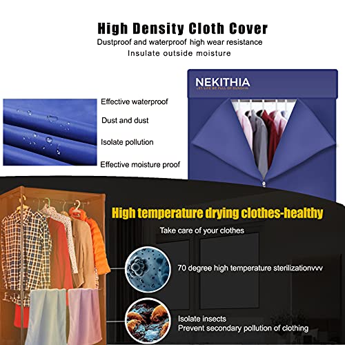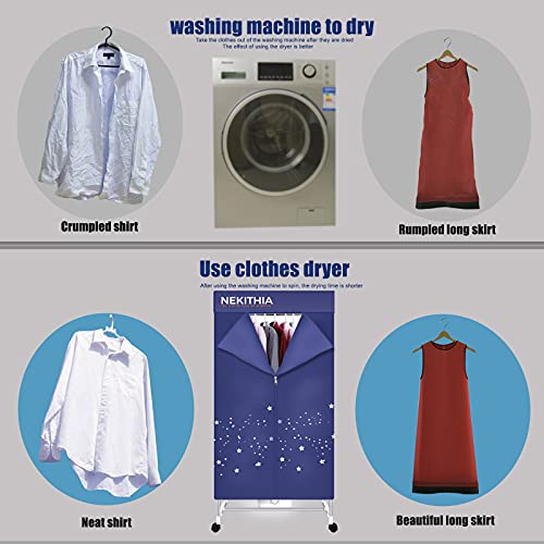Details: Product Accessories: 1. Heater Dryer 2.16 pieces stainless steel pipes 3.Cloth cover 4.Castor (4 pcs) 5.Plastic Support frame(6 pcs) 6.Towel bar(6 pcs) 7.Manual Heater Dryer │ Component Analysis 1.Voltage: 110V, 60Hz 2.Power:1000W 3.Function:Mobile wardrobe style 4.Timing:0-180min 5.General Dimensions:59 x 28 x 21 In 6.Capability: 15 KG Feature of product: Unique design, hanging type clothes dryer, effectively eliminate clothing wear and wrinkles when rolling Safety performance: The electric clothes dryer adopts PT heating material and has an overheating protection device, which is safe, energy-saving and long-life Wide use: light weight, Home Drying, Apartment drying, children's clothing,wardrobe and clothes rack