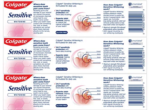 Details: Colgate Sensitive Whitening toothpaste provides 24/7 sensitivity protection with twice-daily brushing. This sensitive teeth toothpaste contains potassium nitrate, clinically proven to soothe the nerves in exposed dentin. With regular use, it provides long-lasting sensitivity relief and removes surface stains to help keep teeth whiter and brighter (with regular brushing vs. non-whitening toothpaste). Plus, Colgate Sensitive Whitening toothpaste helps repair weakened enamel, protect teeth from cavities and provides the freshness you trust from Colgate.