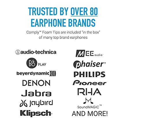 Details: Superior Comfort IComply's Comfort Series Foam Tips are specially designed to provide maximum comfort All Comply Foam products are comfortable but these tips have a unique spherical shape to reduce the amount of pressure on your ear canal That means no more interruptions during your listening sessions due to ear pain Whether you’re enjoying music at home work or on the road the Comfort Series offers a host of fantastic features to enhance your listening experience Comply Premium Memory Foam Advantages 100% better grip than silicone tips ensure they’ll stay secure during a workout 30x softer than silicone material for a comfortable experience and no ear pain 2x external dB reduction for enhanced sound at lower volumes Made in the USA (of U S & imported goods) Body-heat activated foam conforms to shape of ear canal for a secure fit Creates a perfect seal for enhanced sound quality and comfort 100% customer satisfaction Recommended by audiophiles COMPATIBILITY Multiple core sizes to fit all major earphone brands See Comply foam /Compatibility to find the correct Comply core size for your earphone500 core size fits 1More Capsule EO301-C Crystal ANC 64 Audio U-Series AKG N20 K 3003i N40 EO-IG955 K 330 K 350 Chrome K 321 K 340 K 328 Anker Sound Buds Slim Sound Buds Sport IE20 Sound Buds Lite Sound Buds Life Sound Buds Tag most Atomic Floyd models Audio-Technical ATH-E50 ATH-E40 ATH-CKS1100iS ATH-LS200iS ATH-LS50iS ATH-ANC40BT ATH-CK303M ATH-CK70 PRO ATH-CKF303 ATH-CKF505 ATH-IM01 ATH-IM02 ATH-IM03 ATH-IM04 ATH-IM50 ATH-IM50 ATH-E70 Audio fly AF78 AF45 Aukey EP-B40 Brainwave R1 R3 B1 Demon AH-C820 AH-C160W most Fender models Filo F9 F5 Focal Spark Spark Wireless Harman Karson AE NI IENC Jam Transit Ultra JBL T290 E25 T110 T210 Reflect Mini BT Quicksilver Snow Roxy Sunrise Roxy Safari Tim McGraw Quicksilver Vibe J33i J46BT Reflect Mini BT JH Audio Siren Series JLAB Audio Buds Pro JVC HA-FXH30 HA-FXC51 HA-FXC80 HA-FXD80-Z KEF M200 M100 KZ ATE ZS5 ZST LG Tone ULTRA+ HBS-820S Optimus G Quad Beat Tone Pro HBS-780 Libra tone Q-Adapt MPOW Jaws Cheetah Magneto Mice E300 most Noble Audio models Nuforce BE6 Only E900M Outdoor Tech Orcas Plosive PH-BTE50 Pioneer SE-E5T SE-7BT DJE-1500 DJE-2000 QCY Q11 Razer Hammerhead Roving G10 Sport Sennheiser CX-281 IE-6 IE-7 IE-8 IE 80 CX 150 Skull candy INK' d Wireless INK' d Wireless Sound PEATS B10 Q30 Q30 Q36 Symphonized NRG 3 0 Optronics TT-EP01 TT-BH026US TT-BH06 TDK SP60 SP70 TFZ Series 5s Series 1s Think sound Rain2 Tre blab J1 V-Mode Forza ZN VAVA MOOV 28 MOOV 11 Zip buds Juiced