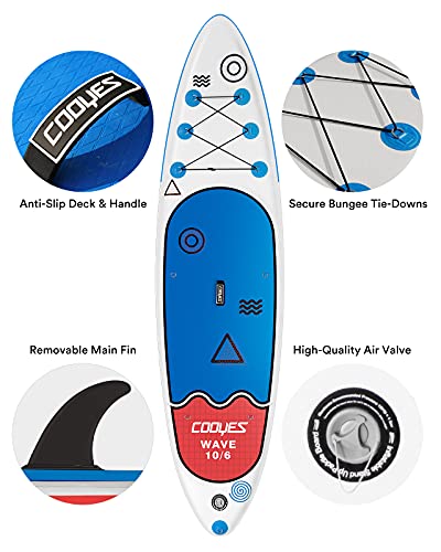 - Extra Wide Design: Easy to stand up and balance on the COOYES 10'6" x 32" x 6" paddle board! The wide deck and performance shape make for fast, fun paddling for all skill levels.