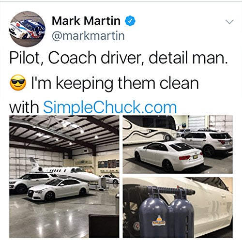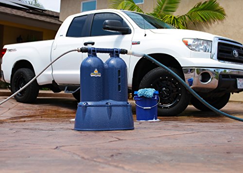 Details: Unit is ready to go upon arrival and includes a Stainless Steel input hose, Pressure Regulator (use if you are unsure if your feed pressure is below 70 psi), quick disconnects for the input/output hoses, wheels and foldable handle. No need for a TDS meter- the filter on right side changes color when expired! Simply remove the Double Chuck from the box, attach the pressure regulator to your hose spigot (IMPORTANT: system has a 70 psi pressure limit and you must use regulator if you don’t know your supply pressure. System performance is not reduced by use of supplied pressure regulator), attach the included stainless steel line to your spigot or pressure regulator then attach your garden hose (or pressure washer!) to the output side and wash to your heart’s content! Stop system use when the bottom two colored panels turn from blue to gold. Double Chuck should be stored away from direct sunlight as this could overheat the filter media and reduce the life of the filters. Of course, you could use the unit all day in the sun w/o worry but please keep your Double Chuck away from storage in direct sunlight. Simple Chuck’s Double Chuck is 23″ tall x 10.25″ deep x 16.5″ wide. Simple Chuck replacement cartridges are available for $144.95 and ordering is, well, simple. When you want a fresh set, you purchase by phone or online and a fresh set will arrive in 2-7 days (locale dependent). Simply drop the expired cartridges in the shipping container, attach the prepaid label, and give ’em to your favorite FedEx driver! Best said by one of our *spotless* family members: “Received the wash system mid day today and a huge THANK YOU for expediting it to me. I just finished washing the coach and it blew me away just how spotless it is."