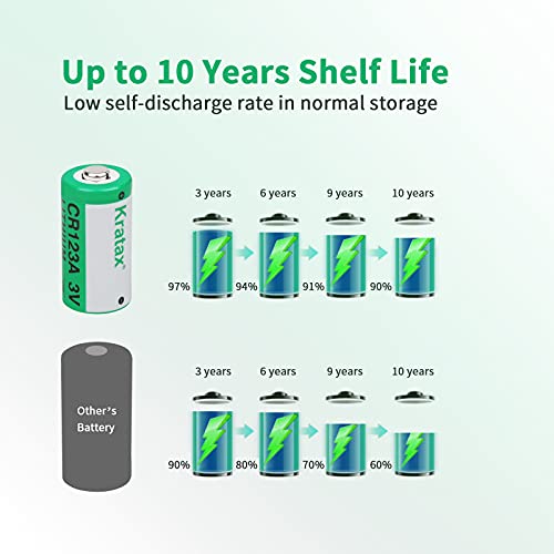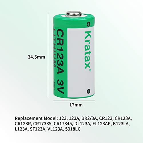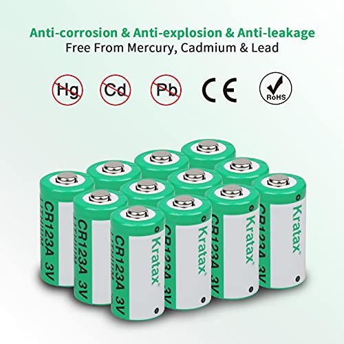 - 📷Safety: Each Kratax CR 123A batteries lithium manganese has been tested under strict quality standards and is CE and RoHS Certified. No mercury, no memory effect, explosion-proof cap and thicken steel shell design make these CR123A 3V lithium batteries anti-corrosion, anti-explosion and anti-leakage.