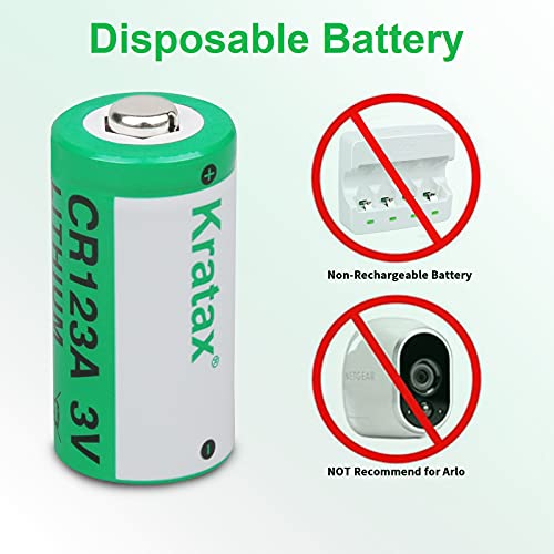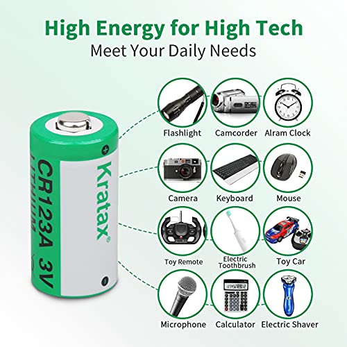 - 📷Wide Application: Kratax 3 Volt CR123A Lithium Manganese Photo Batteries provide dependable performance in Flashlights, Digital Cameras, Digital Camcorders, Smart Home Devices, Smart Sensor, Electricity Meter, Security Cameras, Alarm System, Smoke Detectors, Flash Units, Lasers and more. Ensure that the functions of electronic equipment are maximized.