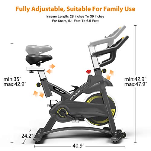 - 💪PERSONALIZED SPIN BIKE- A full adjustable indoor machine for family use. A longer adjustable seat support post, 2-way adjustable non-slip handlebar and 4-way seat for people (inseam 28-39”) to use. Wheels help you to move the cycle bike easily. A good holiday gift.
