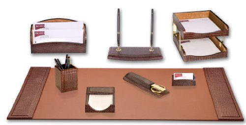 Details: The perfect way to accessorize, protect, and organize your office in style. This complete desk accessory set contains everything you need to outfit your desk. All pieces are made in a lu by urious top-grain leather with a rich crocodile embossed finish. The felt bottoms make all of the accessories safe for your desktop surface, no risk of scratching. This set includes: 34-inch by 20-inch desk pad with side rails, 2 front-load letter trays with stacking posts, pencil cup, 4-inch by 6-inch memo holder, letter holder, business card holder, library set (scissors and letter opener), and double pen stand. Make a style statement in the office with this beautiful matched set.