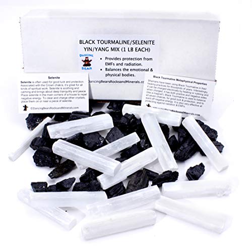 Details: Black Tourmaline and Selenite Crystals (Yin-Yang Mix) 1 Pound Each (quantities will vary). Excellent protection against EMFs and radiation. Place near your computer, around the house, and in your car for optimal protection against negative energy of all kinds. Projects a sense of peace while clearing negative vibes. We mindfully hand-sort our Black Tourmaline and Selenite crystals so the stones you receive will be the very best for crystal healing practices. Since all the stones are natural, there will be a variety of shapes and sizes (the photos are good examples of the stones but will not be exact). Please note: Black tourmaline may need to be rinsed as it is sometimes dusty. Uses for Black Tourmaline & Selenite Crystals: Protects against negative energy (Carry a piece in your pocket). Enhances good energy (Place on your altar). Deflects EMFs and radiation (Keep a few pieces near your computer). Adds beauty to surroundings (Include in home décor). Our products are assembled in the USA by our dedicated team in Eugene, Oregon. People in need worldwide also benefit from your purchase as we lovingly donate 10% of all of our profits to charities near and far. Dancing Bear is proud to provide our customers with a 100% satisfaction guarantee. If you are not completely satisfied, we will gladly refund your money plus all shipping costs.