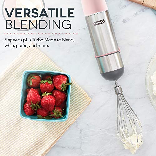 Details: Get pro-chef power with the Dash Chef Series Hand Blender. This 5-speed handheld immersion blender allows for a full range of motion while blending, and comes with Blender and Whisk attachments. The stainless steel exterior gives the Chef Series Hand Blender a durable, elegant appearance, and the stainless blades won’t dull over time. Make soups, sauces, mashed potatoes, whipped cream, meringue, and more! The size of the Hand Blender makes it easier to store than a traditional countertop blender, and makes it so you can blend anywhere you like for full control.