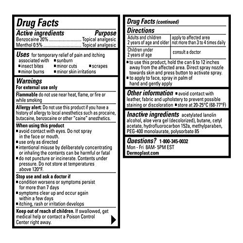 - Relieve pain fast: Childhood and family life are full of little irritations. Use Dermoplast pain and itch spray to quickly relieve the pain and itch of minor cuts, scrapes, burns, insect bites, and sunburn