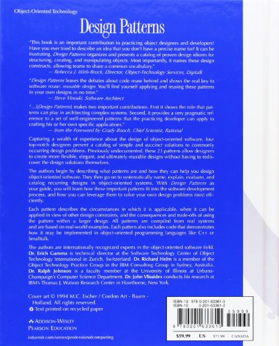 Details: Product Description Capturing a wealth of experience about the design of object-oriented software, four top-notch designers present a catalog of simple and succinct solutions to commonly occurring design problems. Previously undocumented, these 23 patterns allow designers to create more flexible, elegant, and ultimately reusable designs without having to rediscover the design solutions themselves. The authors begin by describing what patterns are and how they can help you design object-oriented software. They then go on to systematically name, explain, evaluate, and catalog recurring designs in object-oriented systems. With Design Patterns as your guide, you will learn how these important patterns fit into the software development process, and how you can leverage them to solve your own design problems most efficiently. Each pattern describes the circumstances in which it is applicable, when it can be applied in view of other design constraints, and the consequences and trade-offs of using the pattern within a larger design. All patterns are compiled from real systems and are based on real-world examples. Each pattern also includes code that demonstrates how it may be implemented in object-oriented programming languages like C++ or Smalltalk. Amazon.com Review Design Patterns is a modern classic in the literature of object-oriented development, offering timeless and elegant solutions to common problems in software design. It describes patterns for managing object creation, composing objects into larger structures, and coordinating control flow between objects. The book provides numerous examples where using composition rather than inheritance can improve the reusability and flexibility of code. Note, though, that it's not a tutorial but a catalog that you can use to find an object-oriented design pattern that's appropriate for the needs of your particular application--a selection for virtuoso programmers who appreciate (or require) consistent, well-engineered object-oriented designs. Review This book isn't an introduction to object-oriented technology or design. Many books already do a good job of that...this isn't an advanced treatise either. It's a book of design patterns that describe simple and elegant solutions to specific problems in object-oriented software design....Once you understand the design patterns and have had an "Aha!" (and not just a "Huh?" experience with them, you won't ever think about object-oriented design in the same way. You'll have insights that can make your own designs more flexible, modular, reusable, and understandable--which is why you're interested in object-oriented technology in the first place, right? -- From the Preface This is one of the best written and wonderfully insightful books that I have read in a great long while...this book establishes the legitimacy of patterns in the best way: not by argument, but by example. -- C++ Report From the Inside Flap This book isn't an introduction to object-oriented technology or design. Many books already do a good job of that. This book assumes you are reasonably proficient in at least one object-oriented programming language, and you should have some experience in object-oriented design as well. You definitely shouldn't have to rush to the nearest dictionary the moment we mention "types" and"polymorphism," or "interface" as opposed to "implementation" inheritance. On the other hand, this isn't an advanced technical treatise either. It's a book of design patterns that describes simple and elegant solutions to specific problems in object-oriented software design. Design patterns capture solutions that have developed and evolved over time. Hence they aren't the designs people They reflect untold redesign and recoding as developers have struggled for greater reuse and flexibility in their software.Design patterns capture these solutions in a succinct and easily applied form. The design patterns require ne