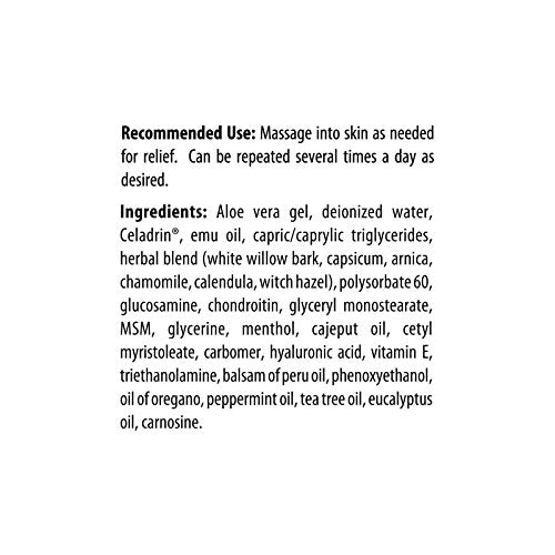 - COMPREHENSIVE INGREDIENTS - Includes Glucosamine, sulfur (MSM), Hyaluronic Acid, Arnica, Chamomile, Aloe Vera, Emu Oil, and Capric/Caprylic Triglycerides.*