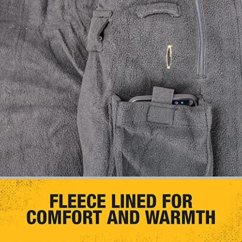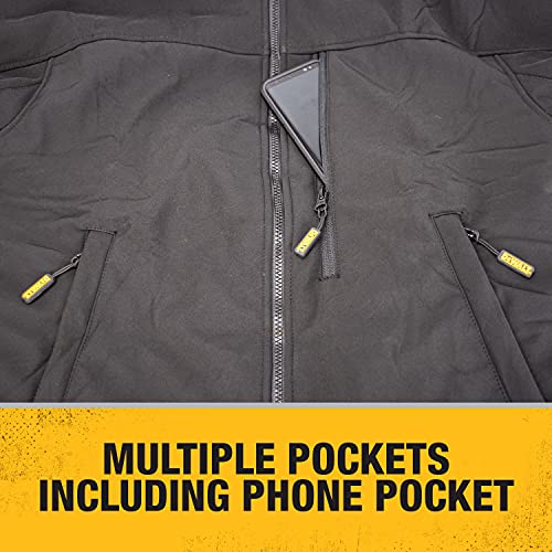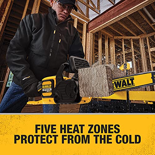 Details: DeWalt 20V/12V MAX Lithium Ion Soft Shell Heated Work Jacket with Battery Kit 20V/12V MAX Lithium Ion Soft Shell Heated Jacket KitFeatures: 20V MAX* and 12V MAX* Batteries can provide hours of core body warmth and continuous heat Up to 9 hours of run time on low setting using the 20V MAX* compact 1.5Ah battery. Durable water and wind resistant outer shell. Shell Material: Soft shell polyester 5 Core heating zones; upper left and right chest, mid-back, sleeves, and collar. LED controller offers 3 temperature settings (high, medium, low) with pre-heat function USB Power Source accepts all DeWalt 20V MAX* and 12V MAX* batteries, includes battery fuel gauge, and 2 USB power ports for charging portable electronics. Battery pocket expands to accept 20V MAX* XR Li-Ion batteries which provide hours of core body warmth and continuous heat. Adjustable waistline and sleeve cuffs 4 Pockets: Left and right waistline, left upper chest, and cell phone pocket 1 Year warranty