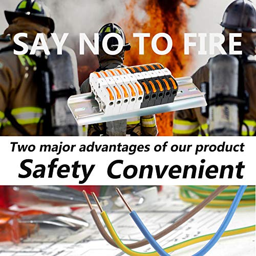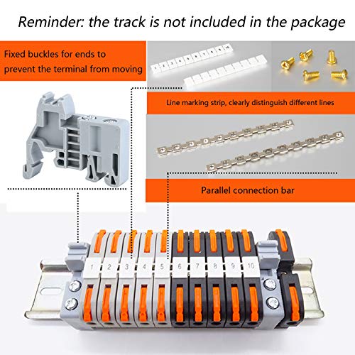 - 【Easy to Use】The patented design, different from the ordinary rail connector, does not require the tedious tightening of screws, just insert the rail terminal into the 35mm iron and aluminum DIN rail, lift the orange clip, insert the wire into the hole until you feel the resistance, then lower the orange lever and complete the operation, saving 70% of the operation time.