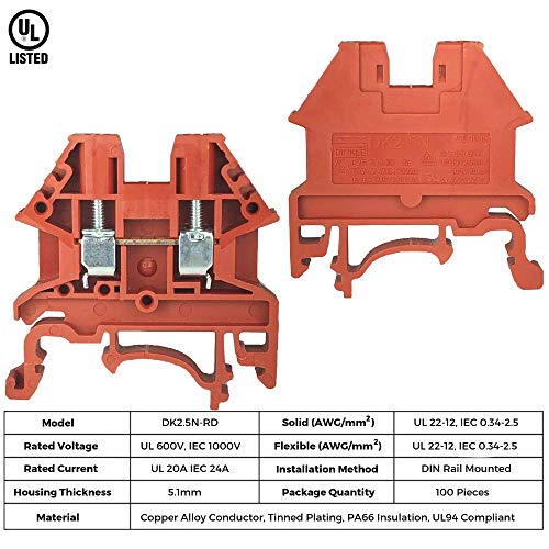 Details: Dinkle DK2.5N-RD red color block has a compact design that saves wiring space. The high reliability and robust design adapts vibration and harsh thermal variation to prevent terminal connection fault. Rated voltage: UL 600V, IEC 1,000 V. Rated current: UL 20A, IEC 24A. Conductor cross-section, solid(AWG/mm2): UL 22-12, IEC 0.5-2.5. Conductor cross-section, flexible(AWG/mm2): UL 22-12, IEC 0.5-2.5. Rated impulse withstand voltage: 6KV. Torque(N-m): 0.4. Screw: M2.5. Wire strip length: 9-11mm. Insulating material: PA. T x H x W(mm): 5.1 x 39.6 x 40.5. End cover DK4NC-RD. Partition DKNSPS-005. Jumper DSS2.5N-02P, DSS2.5N-10P. Marking label TM08W, TM26W.