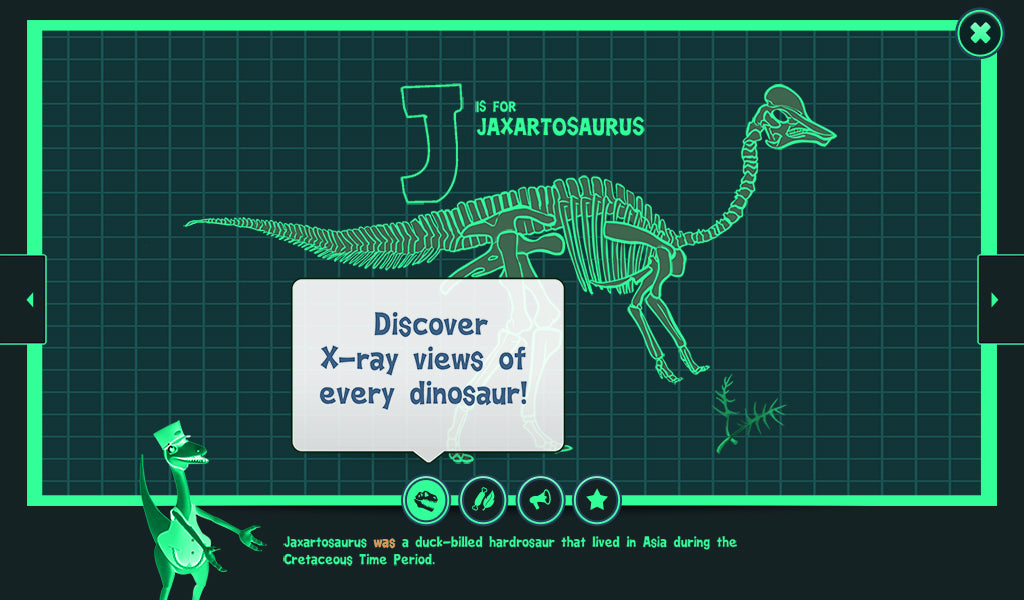 - Learn about 26 interactive dinosaurs and their corresponding dinosaur letters!